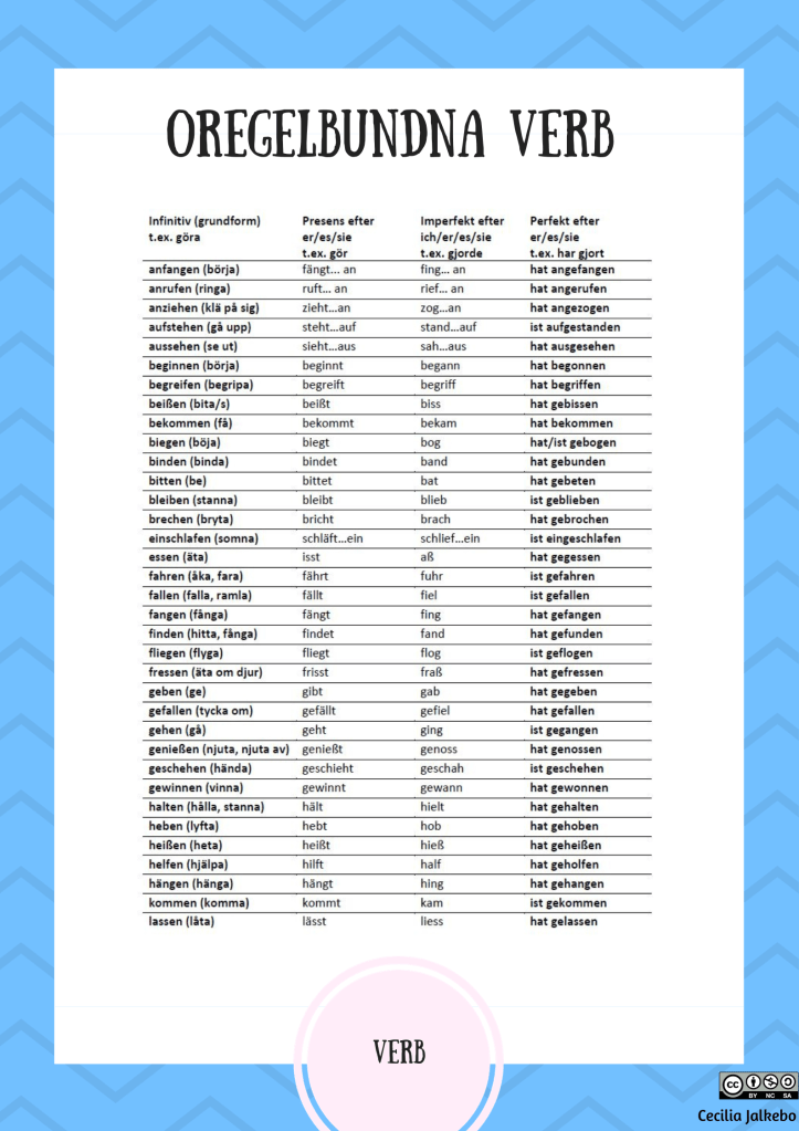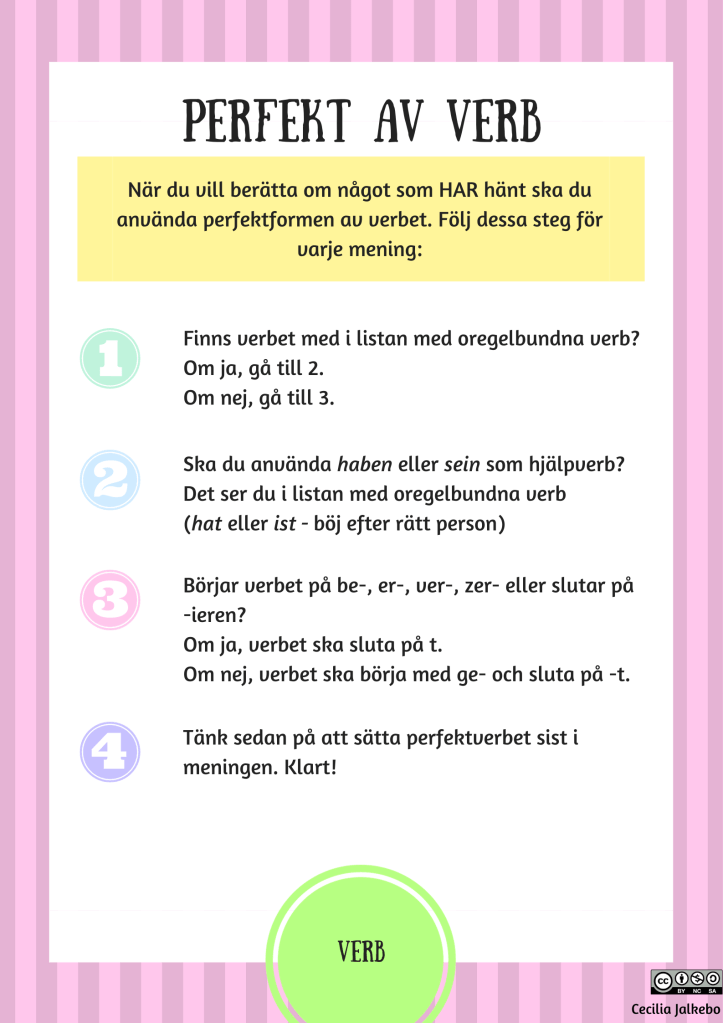 Mina nior kände sig förvirrade över alla grammatiska termer när det gällde verb. Vilket är perfekt nu igen? Vadå, när ska verbet sitta sist egentligen? Jag kände ett behov av att samla ihop allt vi har lärt oss för att kunna repetera de sista veckorna.