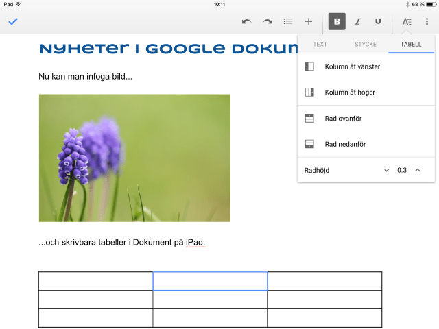 Nyheter i Google Dokument på iPad Den 21 maj, 2015 Av Infoi Okategoriserade Den 13 maj kom en efterlängtad uppdatering av Google Dokument vilket innebär att man nu kan infoga bilder och skrivbara tabeller direkt i appen. Det har jag väntat på! Cecilia Sprid till dina kompisar Dela på X (Öppnas i ett nytt fönster) X Dela på Facebook (Öppnas i ett nytt fönster) Facebook Email a link to a friend (Öppnas i ett nytt fönster) E-post Skriv ut (Öppnas i ett nytt fönster) Skriv ut Dela på LinkedIn (Öppnas i ett nytt fönster) LinkedIn Share on Pinterest (Öppnas i ett nytt fönster) Pinterest Gilla Laddar in …
