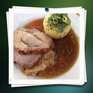 | Schweinebraten, Reibeknödel och Specksauerkraut. |