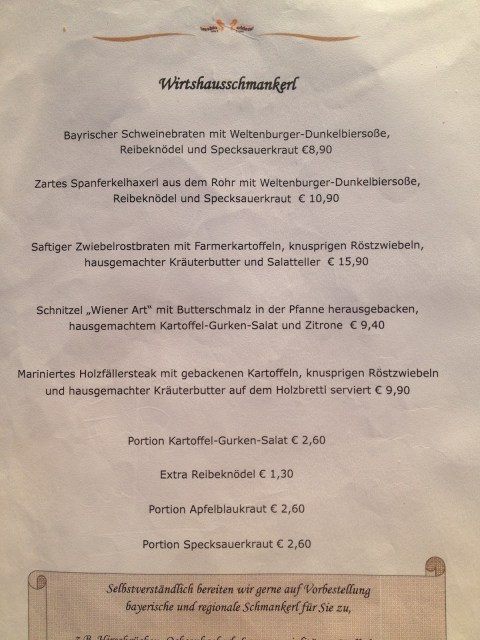 Vissa saker måste man bara äta när man är i Bayern. Kvällens måltid tillhör just den här ”måste-väl-äta-men-egentligen-skulle-jag-äta-vad-som-helst-annat-kategorin”. Ur menyn valde jag Bayerischer Schweinebraten mit Weltenburger-Dunkelbiersosse, Reibeknödel und Specksauerkraut vilket ungefär betyder fläskstek med sås gjord på mörkt öl av märket Weltenburg, palt och surkål med extra fett (det är nu jag önskar att jag vore spansklärare och fick äta tapas hela dagarna, haha).