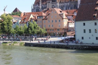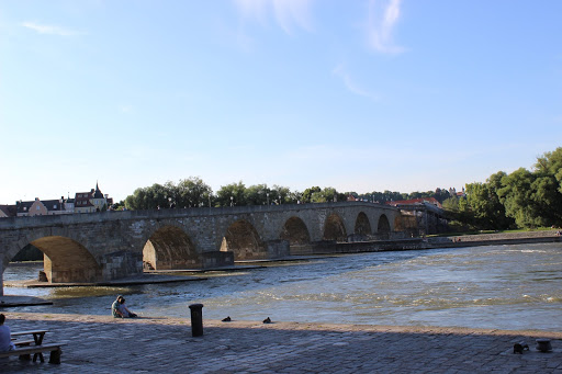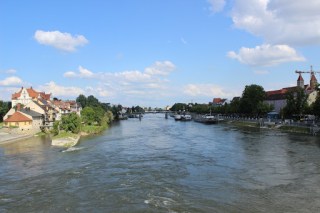 Die Steinerne Brücke – bron gjord av sten – är den andra av Regensburgs stoltheter, byggd redan på 1100-talet. Bron är 330 meter lång och har 15 synliga runda bågar. Bron överlevde flera krig men höll på att förstöras av trafiken eftersom biltrafik var tillåtet ända till 1997 och bussar och taxi ända till 2008. Nu får man bara cykla och gå på bron.